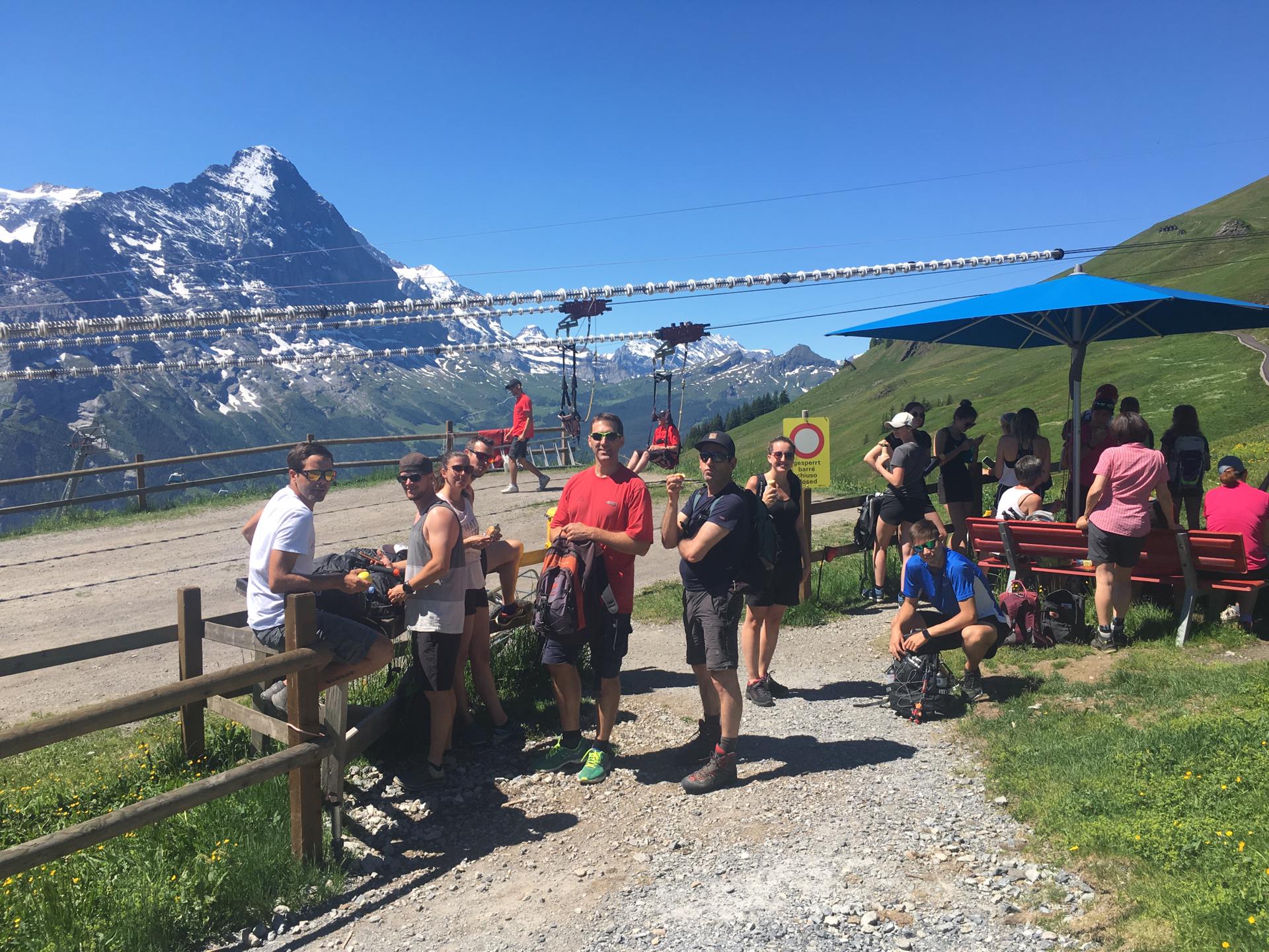 Das Ausflugsziel erfuhren die Teilnehmenden jedoch erst am Treffpunkt am Bahnhof Spiez. Lediglich die mitzubringende „Ausrüstung“ war von Tanja Kurzo, welche den Ausflug organisierte, zum Voraus bekanntgegeben worden. Mit dem Zug reiste die Gruppe dann nach Grindelwald und nach einem kurzen Fussmarsch durchs Dorf mit der Gondelbahn hinauf auf die First, wo bei Kaffee und Gipfeli (manche liessen es sich nicht nehmen, unter der bereits sengenden Sonne eine warme Schoggi zu trinken) zunächst mal das schöne Bergpanorama genossen wurde. Danach stand sanfte Action auf dem Programm. Mit dem First Flieger sausten die Spiezer zunächst mit rund 80 km/h am Seil hängend zur Station Schreckfeld, ehe es mit den Mountain Carts auf drei Rädern weiter Richtung Station Bort ging, wobei hier aufgrund der Strassenverhältnisse eine etwas gemässigtere Geschwindigkeit und eine Sonnenbrille (Staub!) von Vorteil waren. Schon den strahlenden Gesichtern nach zu beurteilen machten diese Aktivitäten, insbesondere die Fahrt mit den Carts, den Beteiligten viel Spass.