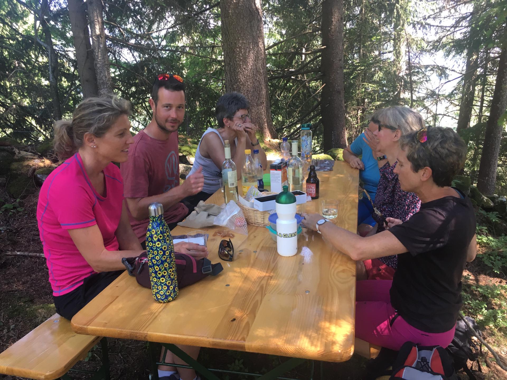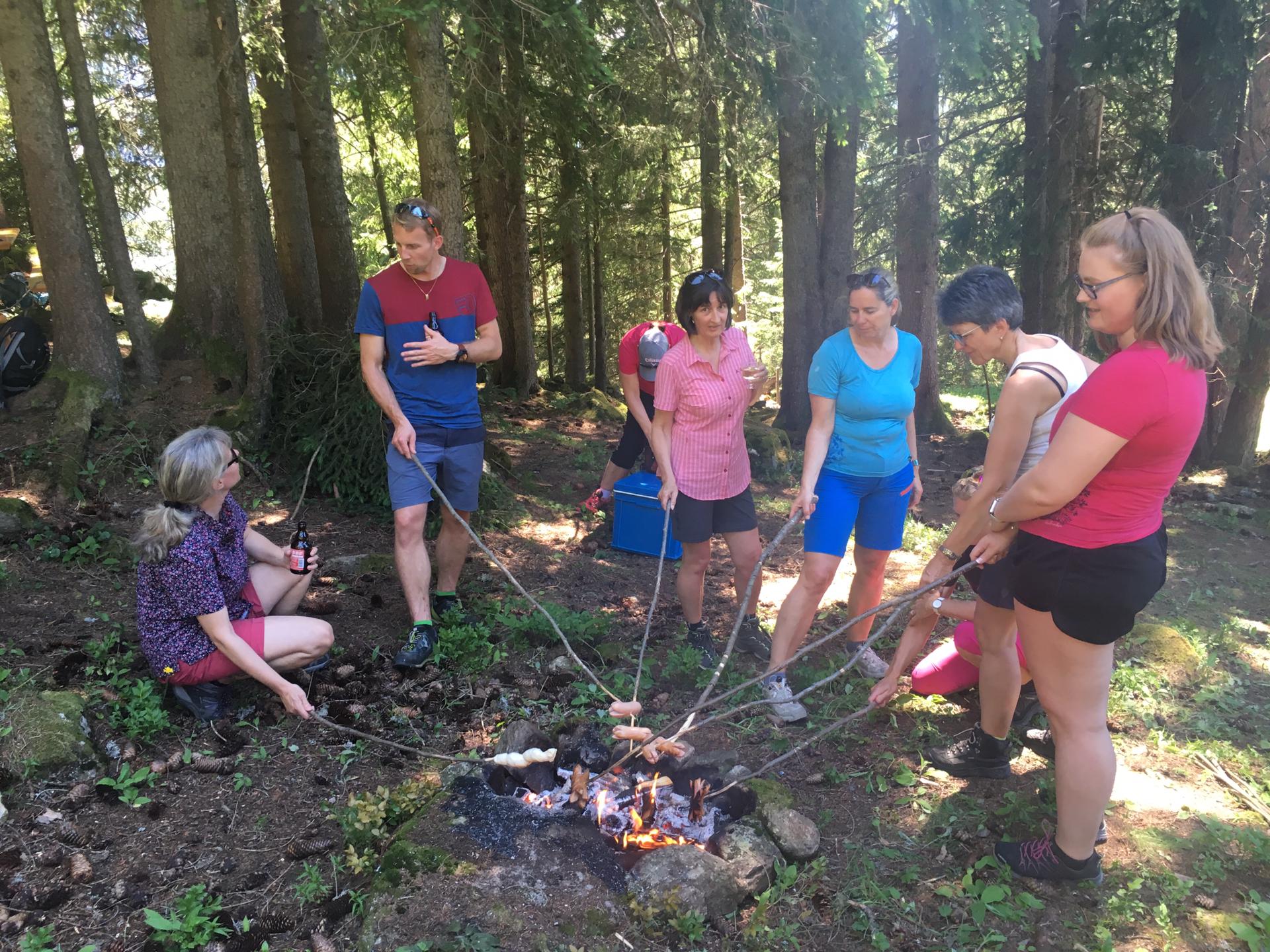 Nach den Aktivitäten stand der gemütliche Teil (Neudeutsch: Entschleunigen) auf dem Programm. Von Bort führte zunächst ein kurzer Spaziergang bergab zur Chrisegg, wo Tanjas Vater Roland im Schatten spendenden Wald bereits äusserst liebevoll eine gemütliche Pick-Nick-Umgebung eingerichtet, ein Apéro vorbereitet und fachmännisch ein Grillfeuer entfacht hatte. Tanjas Grosseltern, welche auf der Chrisegg fernab von jeder Hektik sesshaft geworden sind, zeigten sich ebenfalls sehr gastfreundlich und stellten uns insbesondere ihren Brunnen zur Kühlung der Getränke zur Verfügung, was bei diesem Wetter natürlich sehr willkommen war. Bei Cervelat und Schlangenbrot – dies stand vor Ort bereit – und allerlei selbst mitgebrachter Verpflegung (verhungern musste niemand, verdursten noch weniger) verbrachte die Spiezer Truppe so einen sehr gemütlichen und geselligen Nachmittag, welcher nüchtern betrachtet leider viel zu schnell zu Ende ging.